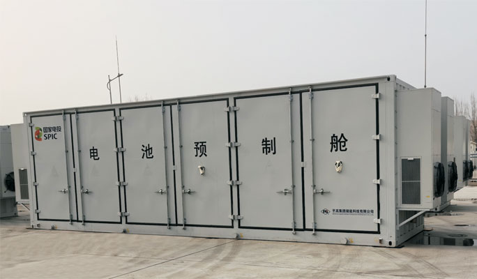 電池儲能預制艙包括:電池艙體,電氣艙、電池架消防通道。電池艙和電氣艙安裝消防和監控系統,電池艙頂部安裝多組散熱系統,電氣艙設有逆電池儲能預制艙包括:電池艙體,電氣艙、電池架、變器。通過電池管理系統對電池組的管理,可實現作為消防通道。電池艙和電氣艙安裝消防和監控系統,電池備用電源而實現儲能電站的功能。電池儲能預制艙成套艙頂部安裝多組散熱系統,電氣艙設有逆變器。通過電性強,系統簡單,體積小,移動性高,對環境適應性強,運行安全池管理系統對電池組的管理,可實現作為備用電源而實可靠。